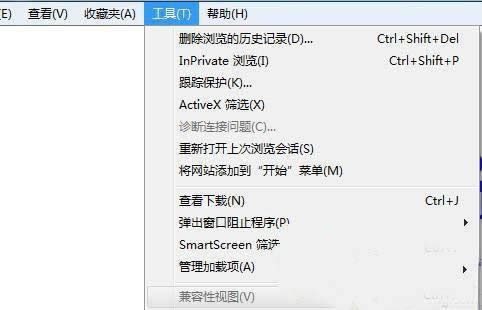 2、在菜單欄處,選擇“工具——兼容性視圖”,則說明此前打開的網站或相關軟件程序都是以兼容性模式運行。