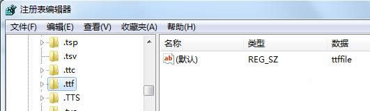 2、在打開的注冊表中,展開以下注冊項(xiàng)HKEY_CLASSES_ROOT.ttf,確保數(shù)據(jù)為 ttffile