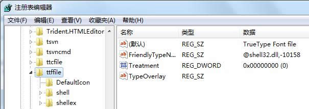 3、再找到HKEY_CLASSES_ROOT\ttffile,確認(rèn)數(shù)據(jù)與下圖示相同。如果不同,找一部正常的電腦,導(dǎo)出注冊表文件,再導(dǎo)入有問題的電腦即可。