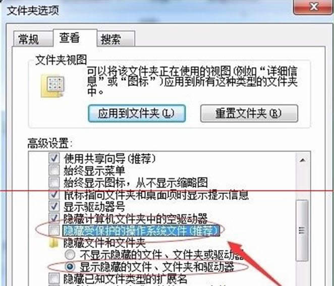 2、在打開的文件夾選項中將“隱藏受保護的操作系統(tǒng)文件”選項前面的勾去掉,然后“顯示隱藏的文件、文件夾和驅(qū)動器”。
