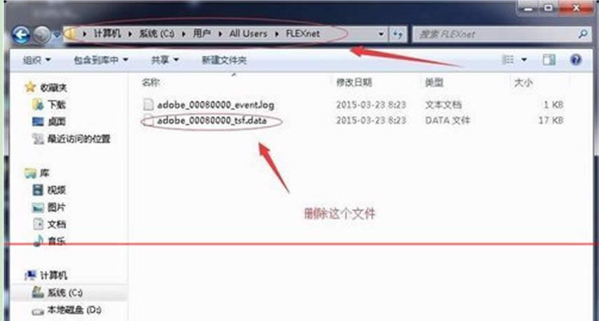 3、如果系統(tǒng)盤為C盤,那么將:c:/用戶/All Users/Application Data/FLEXnet目錄下的adobe_00080000_tsf.data文件刪除掉;