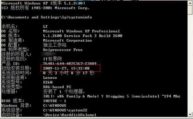 2、在打開的DOS窗口光標(biāo)處輸入“systeminfo”命令,可查看到WindowsXP初裝日期了,無論你以后有無使用Ghost重裝系統(tǒng),還會顯示以前的初裝時間。