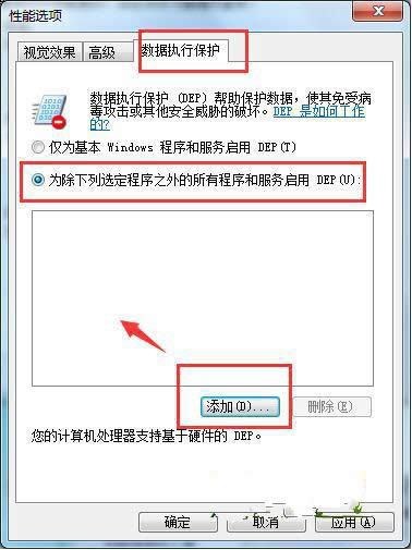 6、性能選項窗口出來之后,將其切換至“數(shù)據(jù)執(zhí)行保護”,選中里面的“為除下列選定程序之外的一切程序和服務(wù)啟用DEP(U)”選項,點擊“添加”從硬盤選中這個程序即可。