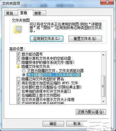 3、在打開的文件夾選項(xiàng)窗口中,文件夾欄目和隱藏文件之間直接選中顯示隱藏的文件、文件夾以及驅(qū)動(dòng)器。