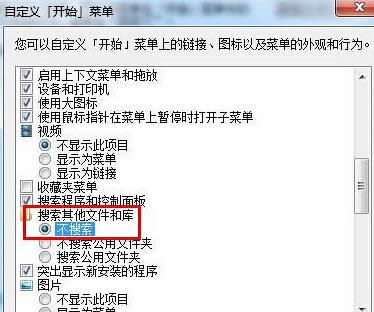 3、下方就是打開(kāi)的自定義開(kāi)始菜單窗口了,在窗口中找到“搜索其他文件和庫(kù)”這一項(xiàng),將下面的設(shè)置更改為“不搜索”。設(shè)置好后點(diǎn)擊確定保存。