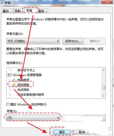 3、在打開的的聲音頁面中,在程序事件欄目里,選擇啟動導(dǎo)航,在聲音項目里選擇無,點擊“確定”按鈕保存后退出。