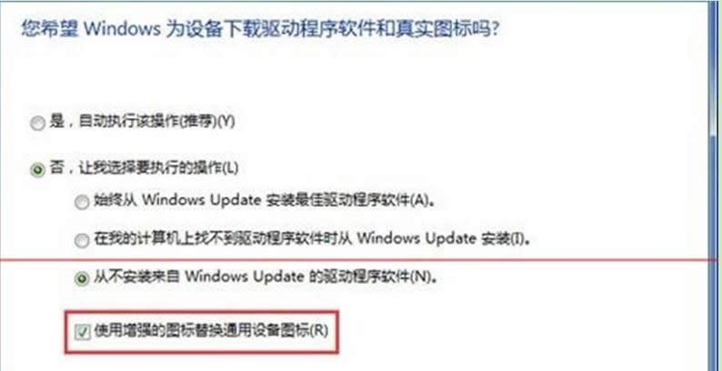 6、在彈出的窗口中,選擇“否,讓我選擇要執(zhí)行的操作”,并選擇“從不安裝來自Windows Update的驅(qū)動(dòng)程序軟件”。