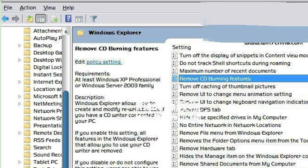 | Windows 7,中文名稱視窗7,是由微軟公司(Microsoft)開發(fā)的操作系統,內核版本號為Windows NT 6.1。Windows 7可供家庭及商業(yè)工作環(huán)境:筆記本電腦 、平板電腦 、多媒體中心等使用。Windows 7可供選擇的版本有:入門版(Starter)、家庭普通版(Home Basic)、家庭高級版(Home Premium)、專業(yè)版(Professional)、企業(yè)版(Enterprise)(非零售)、旗艦版(Ultimate)。 很多用戶不常使用Win7系統自帶一些功能,將不常使用的功能禁用掉,擴大空間內存加快系統運行速度。比如對于已經安裝第三方專業(yè)刻錄軟件用戶來講,系統自帶的刻錄功能作用不大,可將此軟件功能禁用掉,現小編介紹禁用掉技術員聯盟Win7系統自帶刻錄功能的方法。具體如下:1、按“WIN+R”打開“運行”窗口,輸入“gpedit.msc”命令后按回車。 2、在打開的組策略中,依次打開“本地組策略——用戶配置——管理模板—— Windows Components” 3、選中Windows Explorer,然后在右側窗口中找到Remove CD Burning features(移除CD刻錄功能)并雙擊,選中Enable(開啟),重啟生效。 windows 7 的設計主要圍繞五個重點——針對筆記本電腦的特有設計;基于應用服務的設計;用戶的個性化;視聽娛樂的優(yōu)化;用戶易用性的新引擎。 跳躍列表,系統故障快速修復等,這些新功能令Windows 7成為最易用的Windows。 |