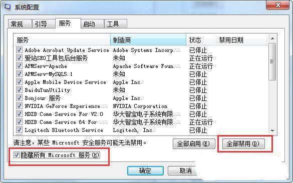 2、切換到“服務”選項,勾選“隱藏所有MicroSoft服務”,查看有沒有別的服務,分別禁用它們。