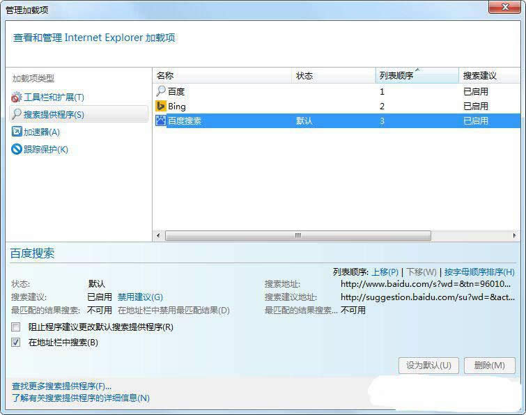 | Windows 7,中文名稱視窗7,是由微軟公司(Microsoft)開發(fā)的操作系統(tǒng),內(nèi)核版本號為Windows NT 6.1。Windows 7可供家庭及商業(yè)工作環(huán)境:筆記本電腦 、平板電腦 、多媒體中心等使用。Windows 7可供選擇的版本有:入門版(Starter)、家庭普通版(Home Basic)、家庭高級版(Home Premium)、專業(yè)版(Professional)、企業(yè)版(Enterprise)(非零售)、旗艦版(Ultimate)。 在Win7系統(tǒng)中使用IE地址欄中輸入欲搜索的關(guān)鍵詞后按回車,有用戶遇到了自動轉(zhuǎn)到一個名為“114”的搜索頁面,使用IE地址欄搜索后Win7筆記本自動轉(zhuǎn)入114頁面怎么回事?針對就此問題,下面小編給大家作出如下原因分析及解決方法。一、原因分析: 114”搜索引擎是微軟與中國電信合作而剛推出的搜索產(chǎn)品,在IE地址欄中輸入非正常網(wǎng)址信息,IE瀏覽器就會自動啟用MSN搜索,稍后再啟用114搜索引擎并進行搜索。 二、解決方法: 1、在打開的IE瀏覽器中,點擊“工具——管理加載項”; 2、打開后選擇“搜索提供程序”,在右側(cè)面板中查看有無“百度”,"google",選擇一個設置為默認即可。 ![]() 將Win7系統(tǒng)中的IE搜索引擎設置為地址欄默認搜索引擎后,就不會再出現(xiàn)上述的問題了。 windows 7 的設計主要圍繞五個重點——針對筆記本電腦的特有設計;基于應用服務的設計;用戶的個性化;視聽娛樂的優(yōu)化;用戶易用性的新引擎。 跳躍列表,系統(tǒng)故障快速修復等,這些新功能令Windows 7成為最易用的Windows。 |