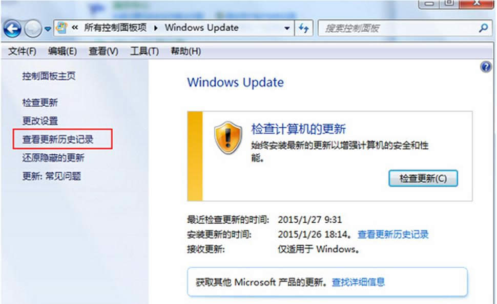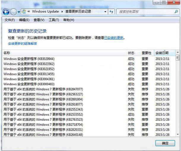 | Windows 7,中文名稱視窗7,是由微軟公司(Microsoft)開發的操作系統,內核版本號為Windows NT 6.1。Windows 7可供家庭及商業工作環境:筆記本電腦 、平板電腦 、多媒體中心等使用。Windows 7可供選擇的版本有:入門版(Starter)、家庭普通版(Home Basic)、家庭高級版(Home Premium)、專業版(Professional)、企業版(Enterprise)(非零售)、旗艦版(Ultimate)。 Win7系統 自帶有WindowsUpdate的更新功能,微軟通過自動更新平臺向用戶推送每月更新補丁,用戶可設置自動更新,也可采用自定義更新,一些用戶想要查看一下之前的更新歷史記錄,怎樣查看呢?下面小編給大家介紹Win7 32位系統中“查看更新歷史記錄”的方法。具體如下:1、點擊“開始——控制面板——windows update”。 3、進入windows update界面后,點擊左側的“查看更新歷史記錄”。 ![]() 3、如果系統有進行過更新,就可查看到系統更新記錄了,如果沒更新過,當然不會有任何記錄,查看完成后點擊“確定”即可。 ![]() 以上就是關于Win7 32位系統中“查看更新歷史記錄”的方法介紹了,還不知道要如何查看更新歷史記錄的用戶,便可通過上面的方法進行查看了。 windows 7 的設計主要圍繞五個重點——針對筆記本電腦的特有設計;基于應用服務的設計;用戶的個性化;視聽娛樂的優化;用戶易用性的新引擎。 跳躍列表,系統故障快速修復等,這些新功能令Windows 7成為最易用的Windows。 |