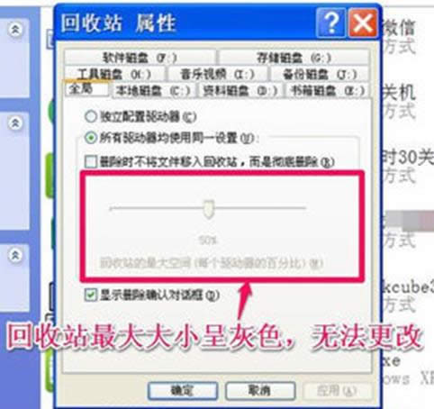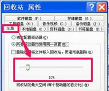 通過以上設(shè)置后,返回到回收站,在空白處右鍵,選擇右鍵菜單中的“屬性”選項(xiàng),在打開的回收站屬性窗口中,選擇“全局”這一選項(xiàng),這時(shí)就發(fā)現(xiàn),可調(diào)節(jié)回收站大小了。