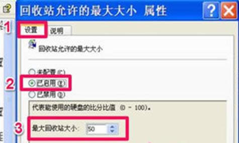 4、在屬性窗口的常規(guī)窗口中,顯示當(dāng)前狀態(tài)為“已啟用”,可將“最大回收站大小”值為大于10以上,比如“50”就是回收站大小為分區(qū)磁盤的50%。