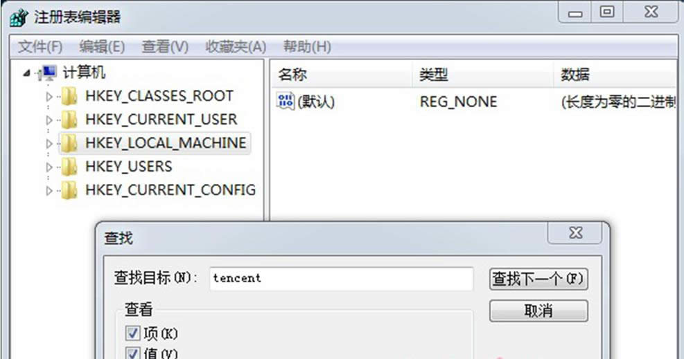 3、打開(kāi)注冊(cè)表,查看tencent的選項(xiàng),將QQ殘留的文件清除掉。