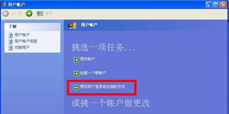 3、打開用戶帳戶,找到并雙擊打開“更改用戶登錄和注銷方式”的選項。
