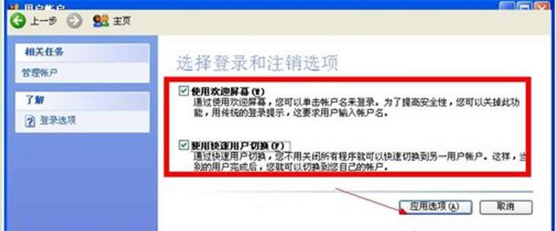 4、在打開的界面中,選擇登錄和注銷選項,在“使用歡迎屏幕”和“使用快速用戶切換”前面打勾,點(diǎn)擊“應(yīng)用選項”。