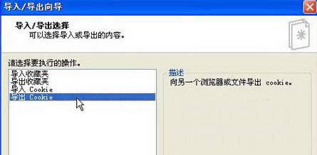 1、打開保存過cookies信息的瀏覽器,打開“導(dǎo)入/導(dǎo)出向?qū)?rdquo;,單擊“下一步”按鈕,在打開的“導(dǎo)入/導(dǎo)出選擇”向?qū)е羞x中“導(dǎo)出Cookie”選項(xiàng),并點(diǎn)擊“下一步”按鈕。