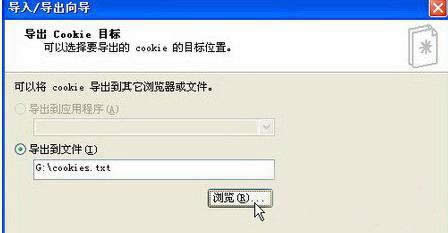 2、在打開的“導(dǎo)出Cookie目標(biāo)”向?qū)ы?yè)中,直接點(diǎn)擊“瀏覽”按鈕指定合適的位置和文件名,完成后,點(diǎn)擊窗口下的“下一步”按鈕。