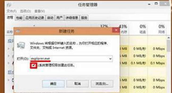 3、在文本框中輸入“Explorer.exe”,并勾選下面的“以系統(tǒng)管理權(quán)限創(chuàng)建此任務(wù)”選項(xiàng),按回車鍵確認(rèn)。