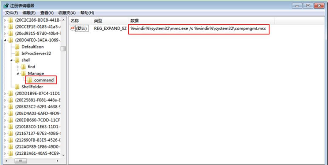 2、依次定位到以下注冊項(xiàng)“HKEY_CLASSES_ROOT\CLSID\{20D04FE0-3AEA-1069-A2D8-08002B30309D}\shell\Manage\command”