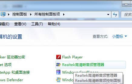 4、以上都在排查是否“未插入”,通過桌面開始菜單,進入控制面板界面,點擊進入“Realtek高清晰音頻管理器”。