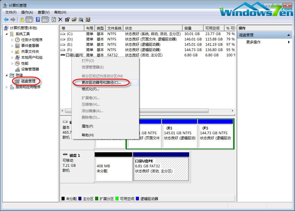 圖三 3.在界面中選擇口袋 U盤PE,右鍵選擇更改驅動器號和路徑。如圖四