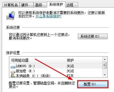 第三步,在彈出來的系統屬性窗口中,我們找到這個配置選項,并點擊進入。如果你的系統以前有設置過還原點,那么這里就可以進去后選擇配置好的還原點進行還原,如果沒有的話,我們這里就選擇配置下方的創建操作。