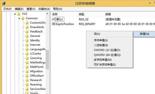 第四步,咱們在右邊的窗口中點擊右鍵,選擇新建dword32位值,并重命名為SignInOptions即可。