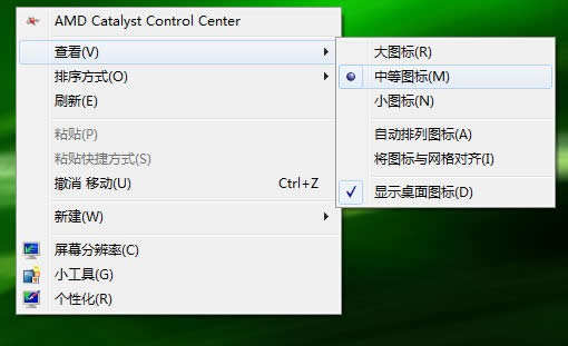 右擊桌面空白區(qū)域,在彈出的快捷菜單中選擇“查看“命令,在展開的級(jí)聯(lián)菜單中可以設(shè)置圖標(biāo)的大小,如選擇“大圖標(biāo)”