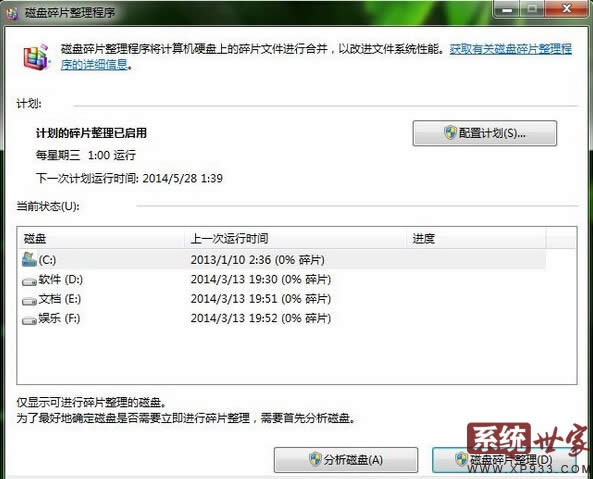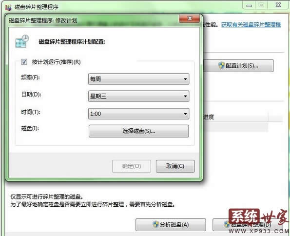 此外,不想每次都手工運(yùn)行磁盤碎片清理的話,也可以通過“配置計(jì)劃”進(jìn)行設(shè)置,讓“磁盤碎片清理”在每周固定的時間自動進(jìn)行,以保證Win7的減負(fù)加速。