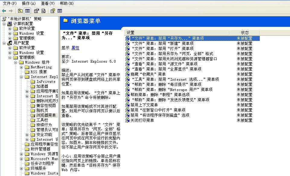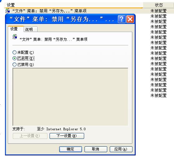 4、與第3步驟同樣的方法將以下策略項目啟用即可:“文件”菜單:禁用另存為網(wǎng)頁菜單項”;“查看”菜單:禁用“源文件”菜單項和“禁用上下文菜單”等策略項目。