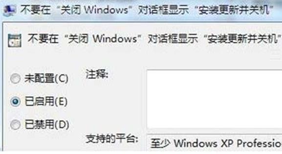 在組策略編輯器中依次展開“用戶配置→管理模塊→Windows 組件→Windows Update”,雙擊右側(cè)窗口中的“不要在關(guān)閉Windows對(duì)話框顯示是否安裝并更新”。然后在彈出的窗口中,點(diǎn)選“已啟用”,最后單擊“確定”按鈕保存設(shè)置。