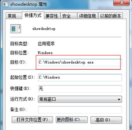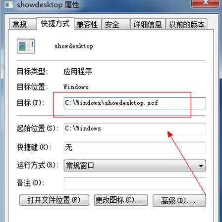 4、再次到C:\windows目錄下,找到剛保存的文件,將showdesktop.exe文件的后綴改為scf,也就是Showdesktop.scf,改完之后,將拖到任務(wù)欄中showdesktop.exe右擊選擇屬性,在打開的屬性窗口中,更改目標(biāo)這一欄的文件名,默認(rèn)如圖所示: