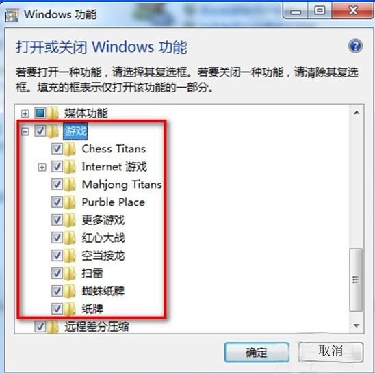 3.進(jìn)入到Windows系統(tǒng)功能窗口,向下滾動(dòng)窗口,找到游戲,打開(kāi)子目錄如下,直接在游戲文件夾前去掉打勾,點(diǎn)擊確定