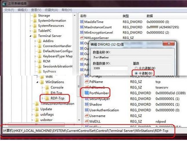 2. 在“注冊(cè)表編輯器”依次定位到 “HKEY_LOCAL_MACHINE\System\CurrentControlSet\Control\TerminalServer\WinStations\RDP Tcp\PortNumber”。