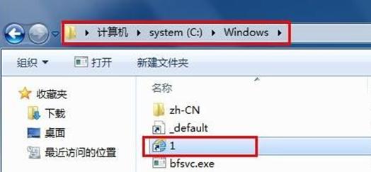 在Win7資源管理器地址欄中輸入“%windir%”,打開Windows文件夾,將剛才桌面上已改名的快捷方式剪切并粘貼到該文件夾中。