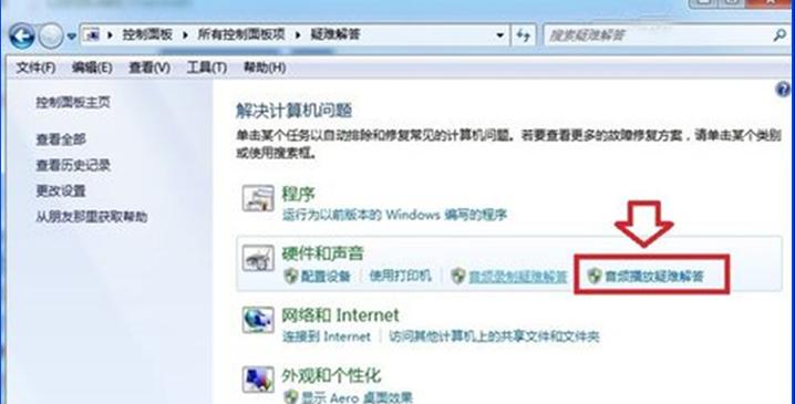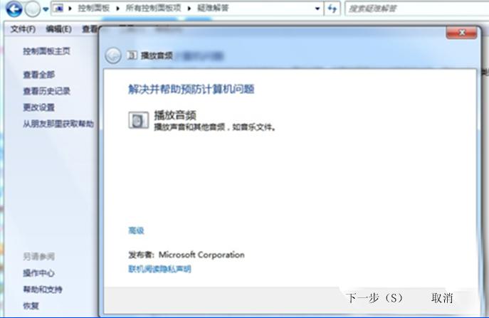 1、依次打開“開始→控制面板→疑難解答→硬件和聲音→音頻播放疑難解答”
