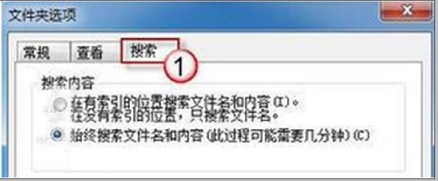 2、在“文件夾選項(xiàng)”中切換到“搜索”選項(xiàng),然后點(diǎn)選“始終搜索文件名和內(nèi)容”。