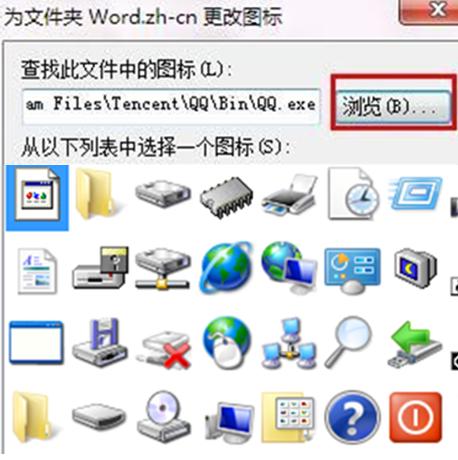 2、接著可以看到系統(tǒng)已提供了不少圖標(biāo),選擇自己喜歡的就OK了。如果覺得系統(tǒng)自帶的不好看,也可使用自己的圖標(biāo):點(diǎn)擊“瀏覽”,找到自己保存的圖標(biāo)或者應(yīng)用程序,確定即可。