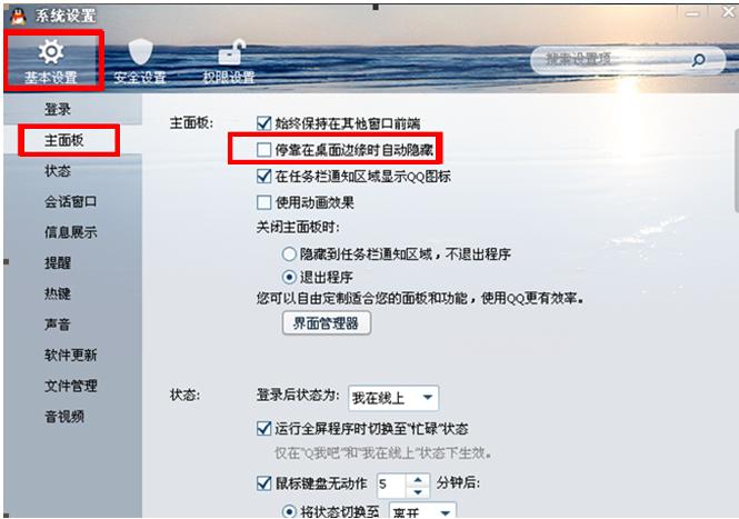 1、通過(guò) QQ 主菜單中的“設(shè)置”-“系統(tǒng)設(shè)置”-“基本設(shè)置”,取消“主面板自動(dòng)隱藏”,徹底關(guān)閉 QQ 主面板的自動(dòng)隱藏。