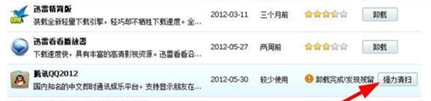 6、接著找到騰訊qq,你會(huì)發(fā)現(xiàn)存在殘留,點(diǎn)擊右側(cè)的【強(qiáng)力清掃】,我們進(jìn)一步刪除無(wú)用的文件