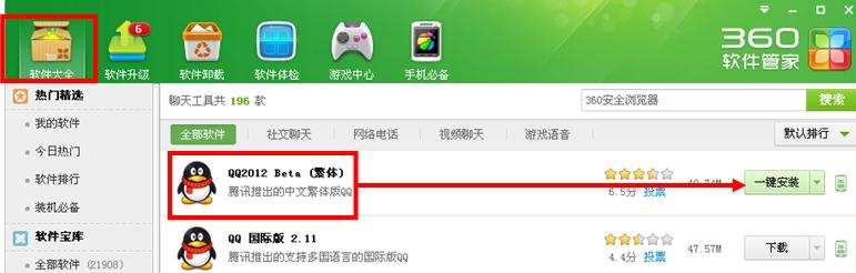 12、接著來(lái)到360安全衛(wèi)士,在【軟件管家】中找到【軟件大全】,在軟件寶庫(kù)中你會(huì)看到有很多軟件,找到qq2012,然后點(diǎn)擊右側(cè)的一鍵安裝。等待幾分鐘,安裝就可以完成了。啟動(dòng)你的qq,看看問(wèn)題解決了沒(méi)有。