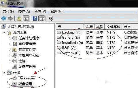 2、彈出計(jì)算機(jī)管理窗口,點(diǎn)擊“磁盤管理”,右側(cè)就會(huì)顯示電腦磁盤各個(gè)分區(qū)分卷信息,如圖:
