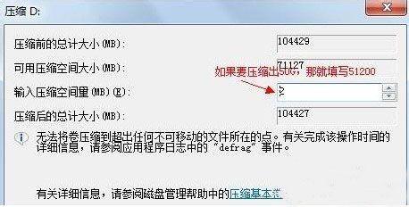 3、選擇一個(gè)磁盤空閑空間比較大的進(jìn)行壓縮,比如把D盤的一些磁盤空間分配到C盤,右擊D盤卷,在彈出的菜單中選擇“壓縮卷”然后在輸入壓縮空間量(MB)里填寫要壓縮出的空間量,如果需壓縮出50G,就填寫51200(50GX1024MB=51200M)即可,如圖: