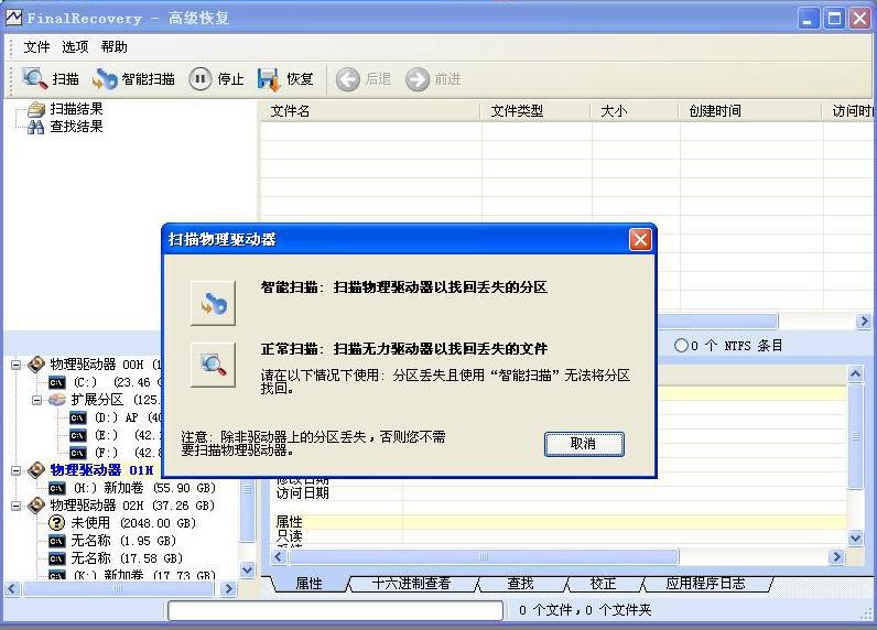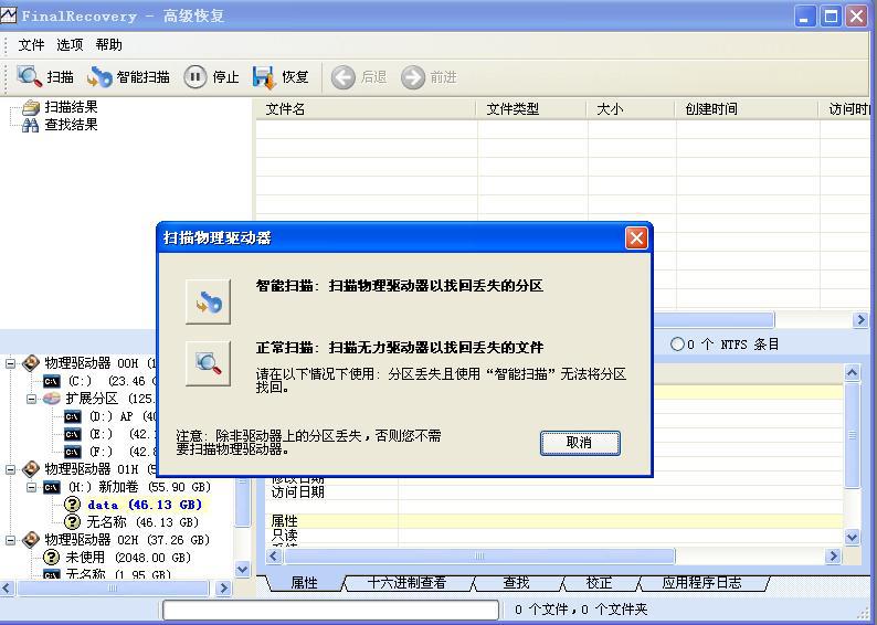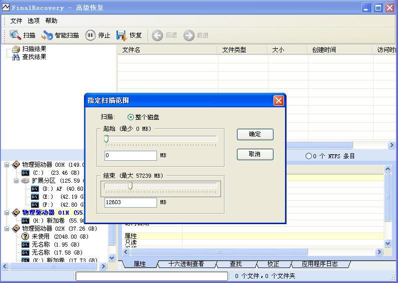 3、如果硬盤分區(qū)表已經(jīng)損壞,請(qǐng)先選擇智能掃描,讓它找到分區(qū)信息(技巧:如果你能大概確定分區(qū)開始的位置,就不需要每次都掃描整個(gè)硬盤,而是直接選擇分區(qū)開始前的一段掃描就可以了)