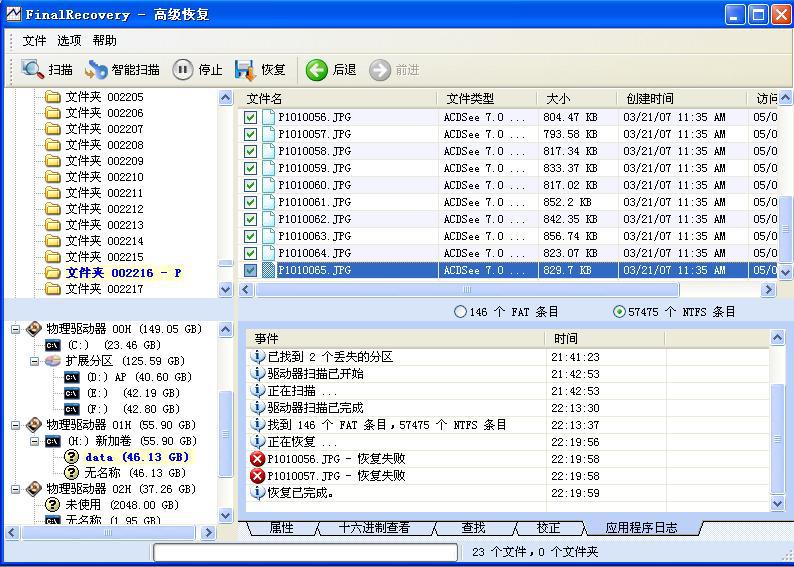 8、恢復(fù)完成后,你會(huì)在右下的狀態(tài)欄看到恢復(fù)的情況,以及恢復(fù)失敗的文件: