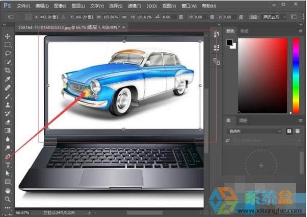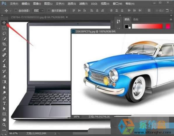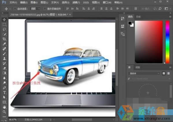 5、然后按住shift鍵拖動(dòng)汽車圖片,使得兩張圖片在一個(gè)文件中顯示。
