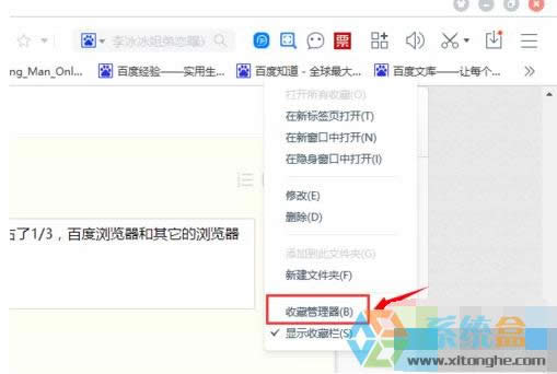 2、我們可以在任意一個我們收藏的網(wǎng)站上鼠標右鍵單擊,這時在彈出的菜單中選擇“收藏管理器”。