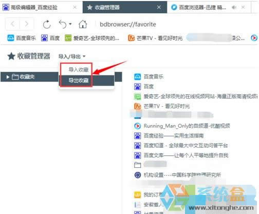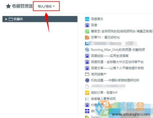 3、進入收藏管理器后,我們就能看到一個百度瀏覽器的收藏夾界面,在界面左上角能看到“導(dǎo)入/導(dǎo)出”選項,單擊該選項。