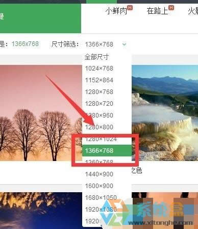 3、這時候我們需要在右側的尺寸篩選上選擇自己需要的壁紙尺寸,小編的電腦尺寸是1366X768,所以這里我選擇的是1366X768。